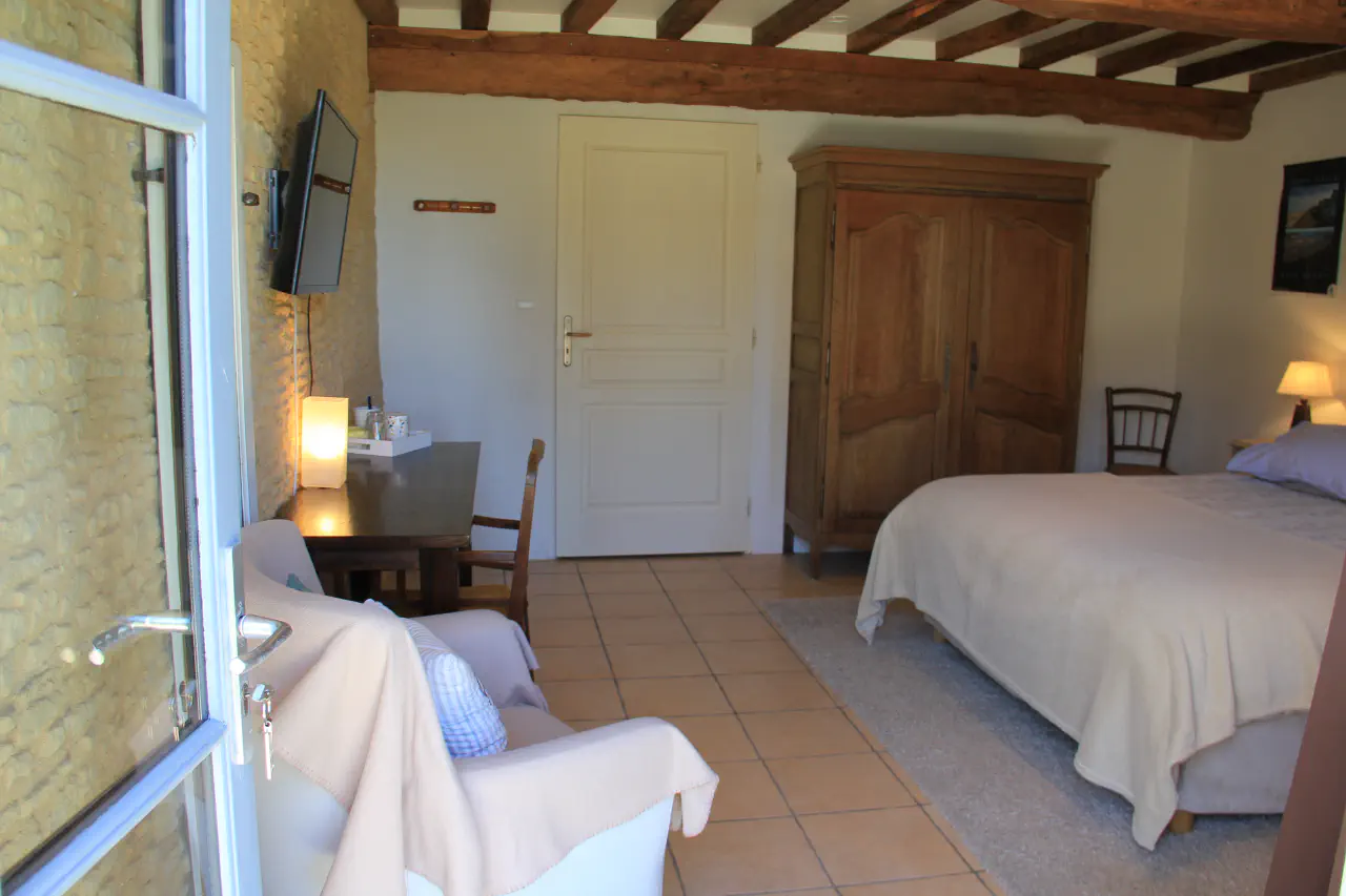 Chambre très spacieuse en rez-de-jardin. Lit queen-size. Salle d'eau et WC privés avec douche à l'italienne. Entrée indépendante. Linge de toilette et linge de lit inclus. Petit plateau de bienvenue (thé, café, infusions). Équipement bébé possible.